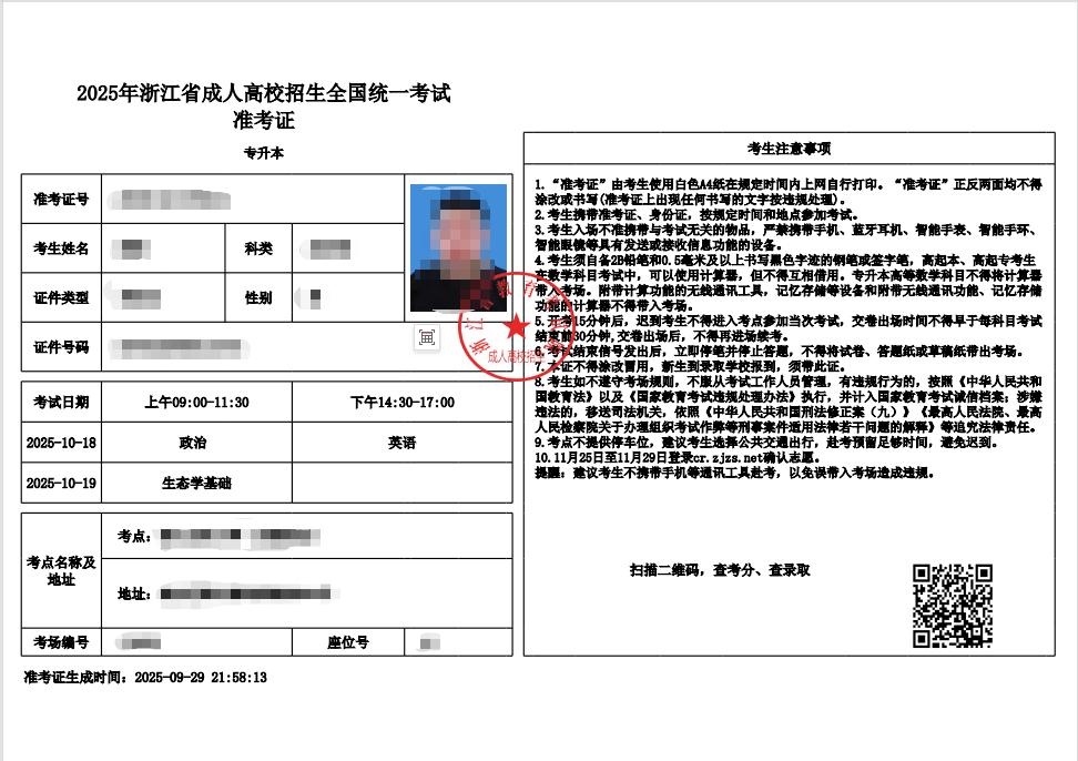 2025年浙江成人高考将于10月18日(周六)至10月19日(周日)进行,我校为各位考生准备了一份考试注意事项,请大家务必仔细阅读!