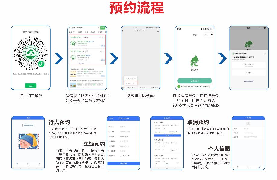 我校对校外车辆和人员实行进校需进行预约登记管理,进校前通过微信搜“浙农林进校预约”进行登记,车辆预约一次预约当日有效,自动识别车牌入校;行人预约一次预约长期有效,扫通行码或刷身份证入校(行人进校通道待改造完成后实施)。