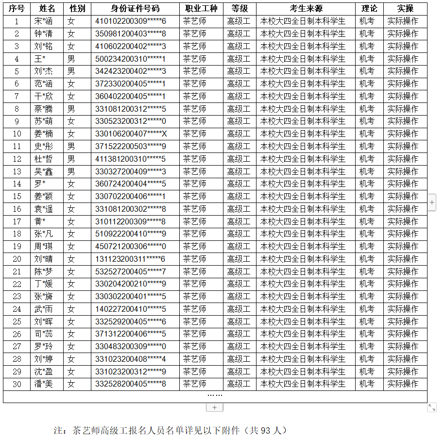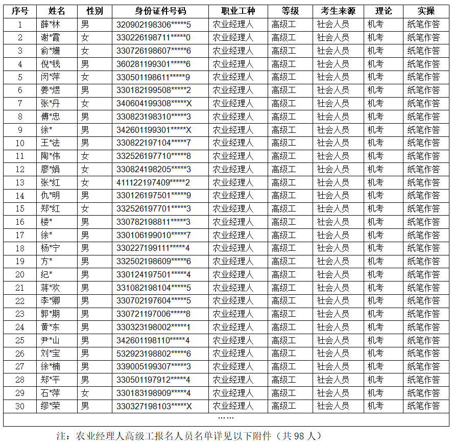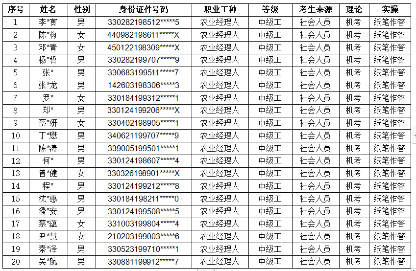 根据浙人社办《浙江省社会评价组织职业技能等级认定操作指南(试行)》(浙人社办发【2022】3号)要求,经浙江农林大学继续教育学院对考生报名材料统一审核,现将参加2025年职业技能等级认定2025-Y-007692批次(茶艺师高级工)、2025-S-007352批次(农业经理人中级工)、2025-S-007353批次(农业经理人高级工)的考生名单予以公示。