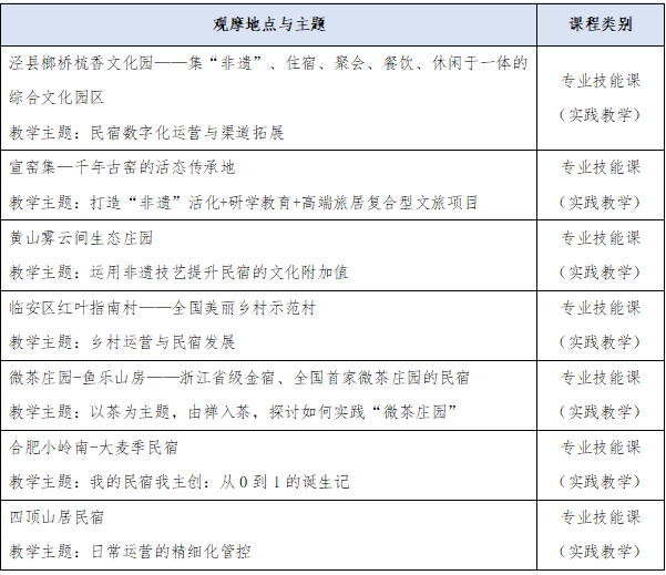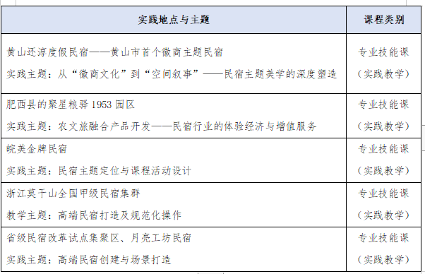 选取全国甲乙级民宿、皖美金牌民宿、休闲农业园区,开展场地实训+模拟教学+顶岗实习+实践孵化实践教学,将课堂理论转化为实际操作能力。