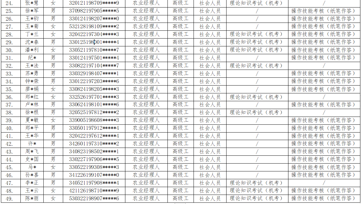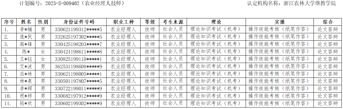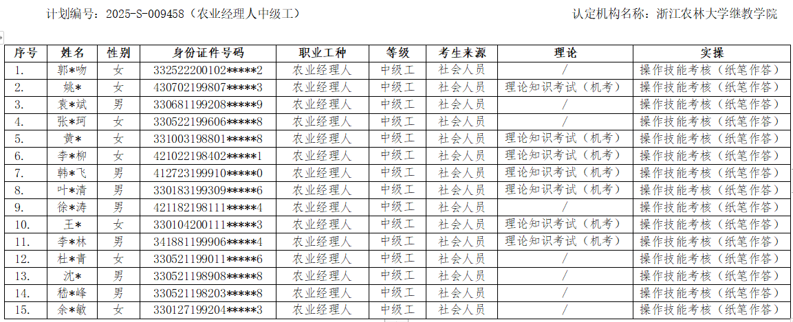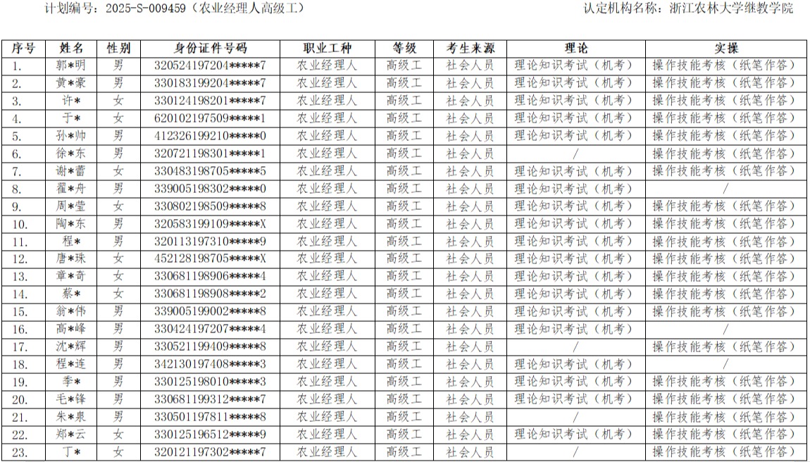 根据浙人社办《浙江省社会评价组织职业技能等级认定操作指南(试行)》(浙人社办发【2022】3号)要求,经浙江农林大学继续教育学院对考生报名材料统一审核,现将参加2025年职业技能等级认定2025-S-009458批次(农业经理人中级工)、2025-S-009459批次(农业经理人高级工)、2025-S-009462批次(农业经理人技师)的考生名单予以公示。