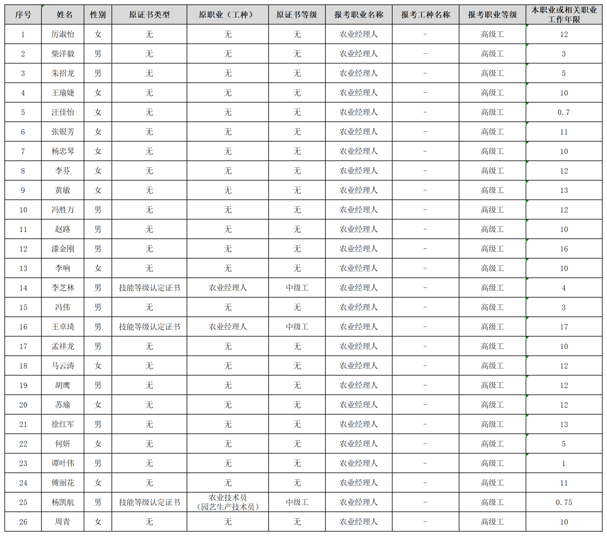 根据浙人社办《浙江省社会评价组织职业技能等级认定操作指南(试行)》(浙人社办发【2022】3号)要求,经浙江农林大学继续教育学院对考生报名材料统一审核,现将参加2026年职业技能等级认定2026-S-000281批次(农业经理人中级工)、2026-S-000283批次(农业经理人高级工)的考生名单予以公示。