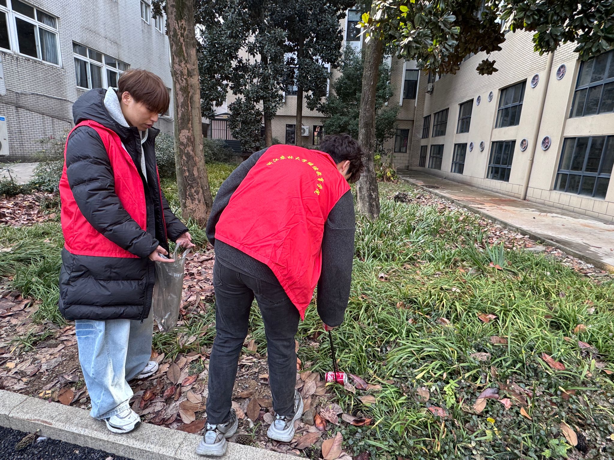 活动中,志愿者身着红色志愿服,手持清洁工具分组协作,重点清理路面、草丛中的垃圾及卫生死角,徒手清理地面脏物并对垃圾进行简单分类。经过全体志愿者的辛勤劳动,打扫区域呈现洁净舒适的良好面貌。