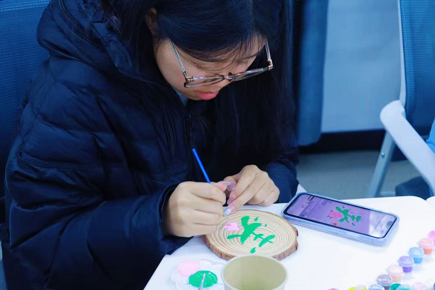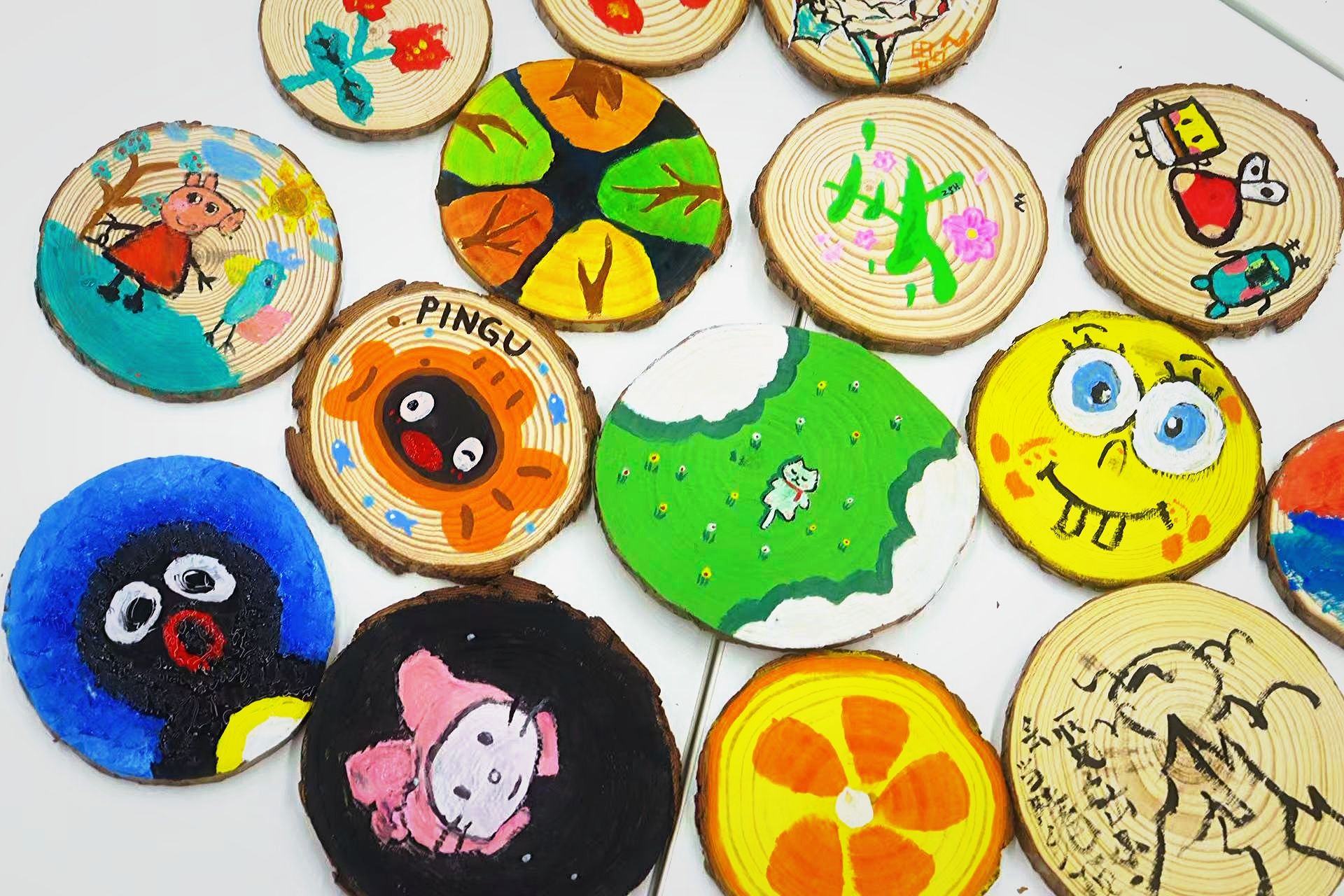 本次活动打破传统植树模式,以年轮木片为载体,打造沉浸式创意体验场景。现场陈列的年轮木片纹理独特、颇具艺术感,成为专属“青春画布”,吸引同学们积极参与创作。活动现场氛围浓厚,同学们手持画笔,细描年轮肌理、挥洒创意色彩,让颜料与木纹自然交融。大家结合木片纹理构思创作,在创作中与自然对话,感受生态之美。
