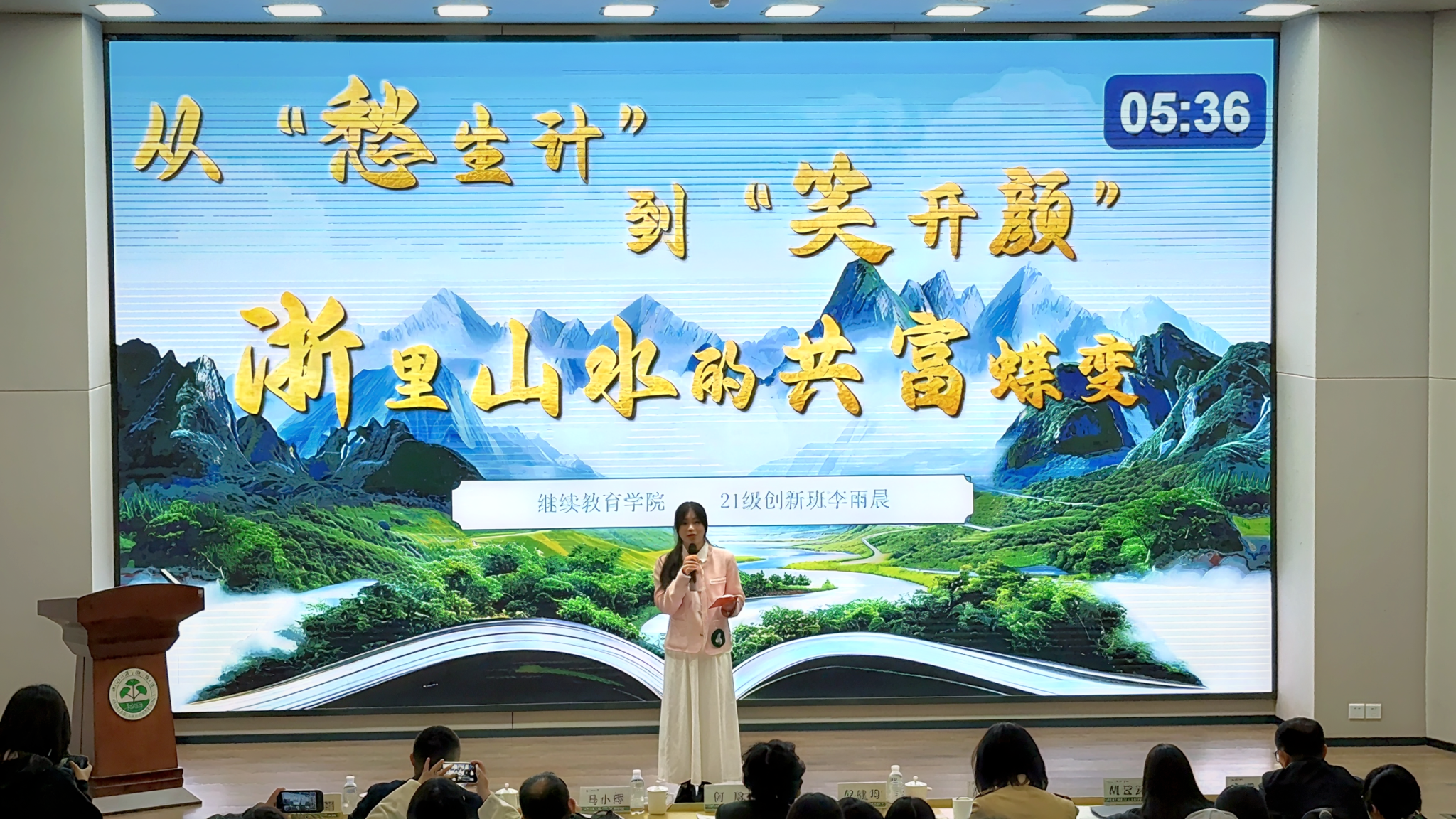 讲述中,李雨晨娓娓道来,与大家现场分享了《从“愁生计”到“笑开颜”:浙里山水的共富蝶变》的故事。她以浙江“千万工程”经验为主线,用鲜活事例为大家解锁乡村共富的浙江密码;用一组组家乡生态产业发展数据,诠释“绿水青山就是金山银山”的时代价值,实现思政小课堂与社会大课堂的有机融合。